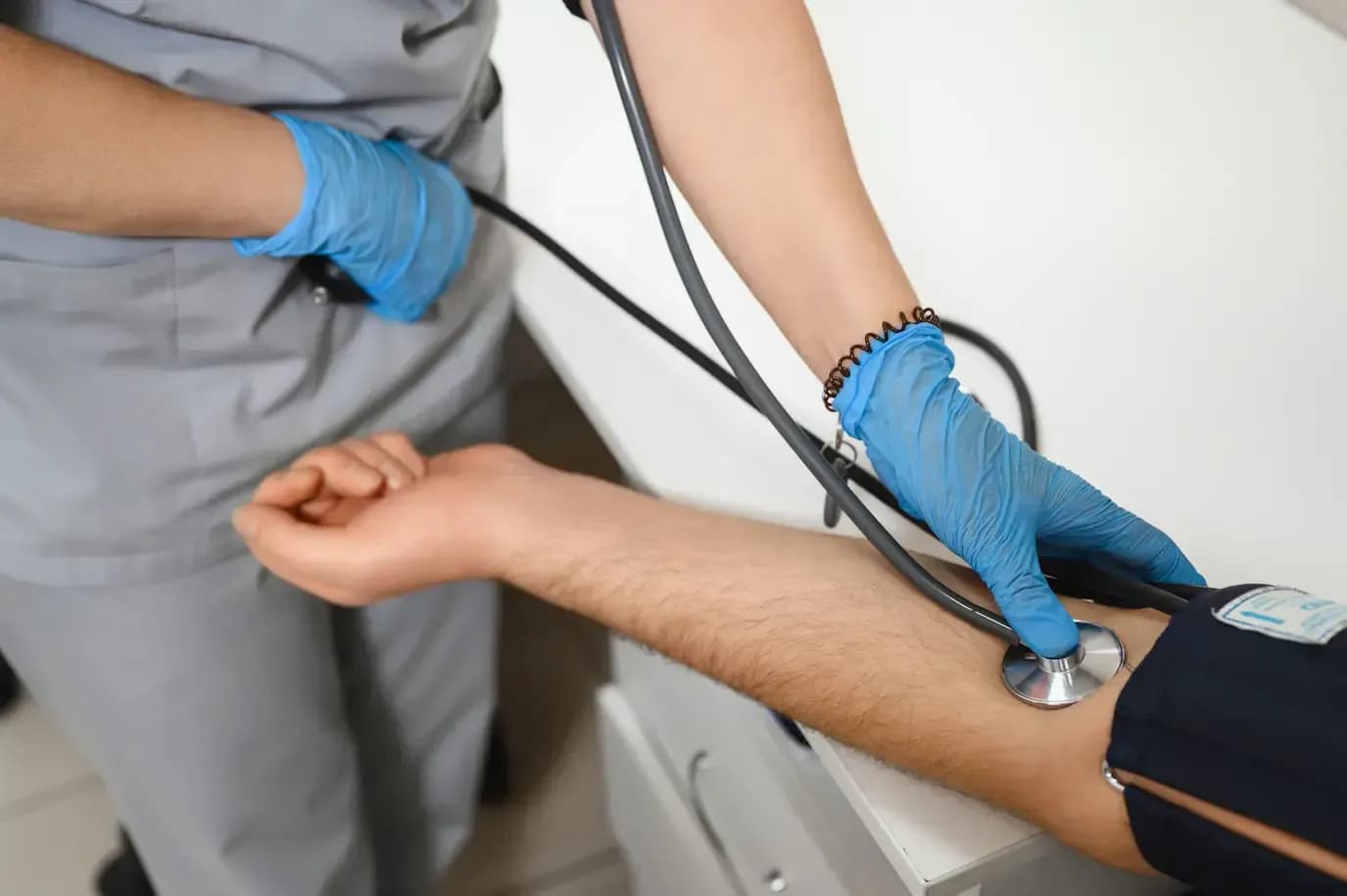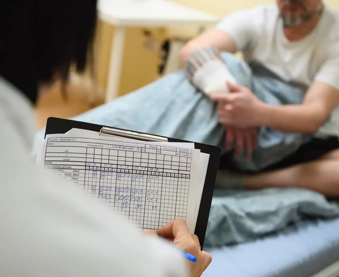 Первичный осмотр и диагностика — врач измеряет артериальное давление, пульс, оценивает общее состояние, собирает анамнез о длительности употребления и хронических заболеваниях